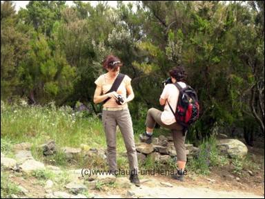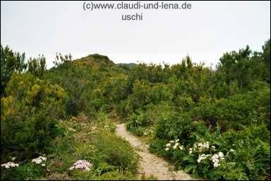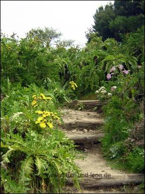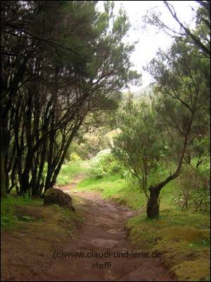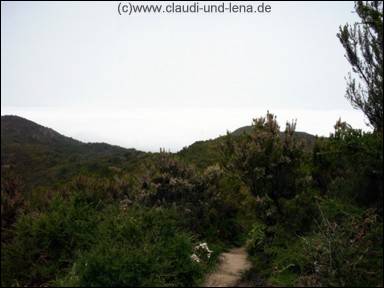 Nachdem wir uns gestärkt hatten fuhren wie einen Parkplatz weiter an, von dort aus kann man auf einem sehr schönen Weg den Gipfel das Gargajonay (1472m) besteigen. Die Landschaft ist unbeschreibbar und der Lorbeerwald ist auch sehr interessant. Mittlerweile waren wir auch über den Wolken...gut, ich gestehe es, es ist ja ein Nebelwald, also ist man dort ständig über den Wolken, aussehen tut es trotzdem gut. |