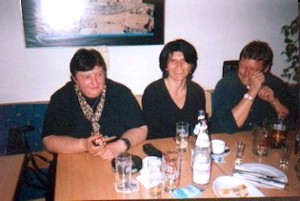 Leider war Handyverbot dort oben, aber Susannes Handy klingelte doch immer wieder. Captaino wollte den Weg wissen. Er erwartete uns dann auch unten am Fernsehturm und nahm den falschen Embona und Sofia sowie Susanne auch noch im Auto mit. Wir anderen liefen zurück. Im Vereinsheim wieder angekommen versuchte ich erst einmal den Tisch zu überblicken, auf einmal rief es von einem Tisch am Eingang : " Ich muß doch den Embona ins Koma knutschen !" - So eine Überraschung, saß doch Laki mit Pepe am Tisch :-) Und Thommy und ich sind direkt an ihr vorbei gelaufen ohne sie zu sehen ! Muss der Höhenunterschied gewesen sein *g Nun hatten wir drei Überraschungsgäste, ein feines Treffen *freu Leider musste Uno wieder gehen, da er noch auf einen Geburtstag eingeladen war. Dazu noch am Sonntag morgen in die Kirche zu einer Konfirmation, der Ärmste |