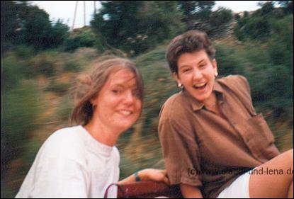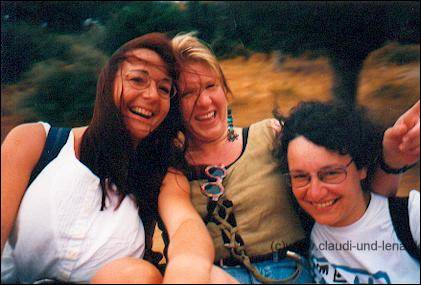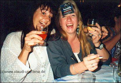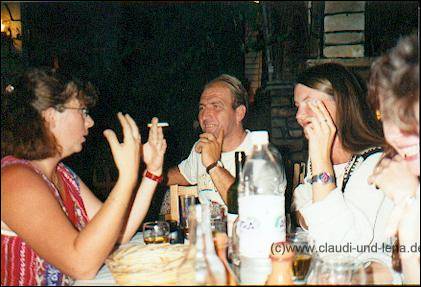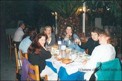 Der Wein, ein Rose, Samaina, war aber auch zuuu gut ;-) Wie hier Steffi und Uschi zeigen. Damit wir nicht mitten in der Nacht heimlaufen mussten hat uns Manolis dann in seinem Suzuki Minibus den Berg nach Ormos hochgefahren, dass der Bus dort mit uns 8 Personen drin überhaupt den Berg hochgekommen ist wundert mich heute noch *g Den leichten Fischgeruch haben wir großzügig überrochen ;-) |