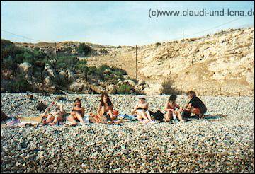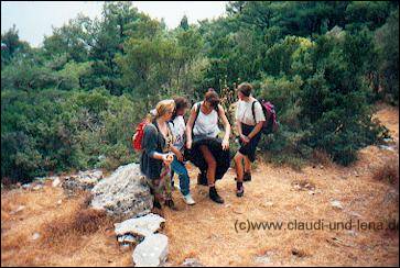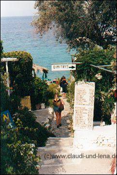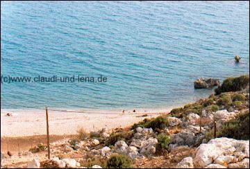 Auf dem Rückweg von Vathy machten wir dann noch an der Tsamadou Bucht halt, laut Reiseführer die schönste Badebucht von Samos. Oh wie waren wir enttäuscht, der Weg hinunter war ja noch ganz schön, aber wir, zumindest diejenigen, die schon andere griechischen Strände kannten wie auf Kreta und der Chalkidiki, fanden sie gar nicht so toll. |
