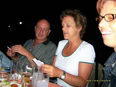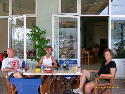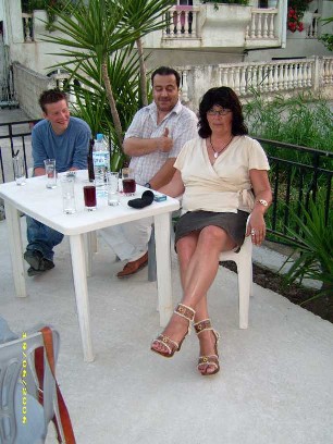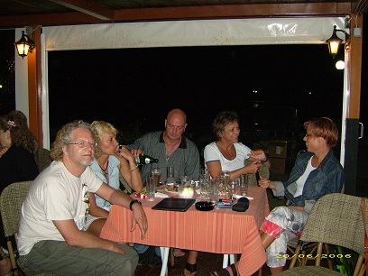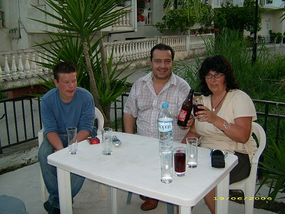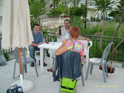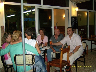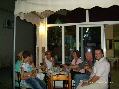 Wir waren Donnerstag nochmal in Ammoudia, Sonne tanken und Strandschönheiten bewundern *g Donnerstag Abend saßen wir mit Vicky und Vangelis gemütlich bei Vassilis um nochmal Souvlaki und diverses zu essen, als Vangelis meinte, die ehemalige Disco hätte heute Eröffnung als Bouzukia Kneipe und er wolle uns dorthin ausführen...nach längerem hin-und her brachen wir dann auf und saßen erstmal, gemeinsam mit Vasilis in der dortigen Strandbar, bevor wir dann gegen 1 Uhr in die Kneipe reingingen. Dort haben wir dann den zweiten seltsamen Typen vom Fußballspiel als guten Bouzukia Sänger erlebt. Es war ein wirklich toller Abend, vorallem, da es mein erster Bouzukia Abend überhaupt war. Gegen 3 Uhr waren wir dann in unserern Zimmern, mussten wir nich am nächsten Tag nach Saloniki fahren. |