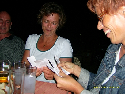 An dem Abend waren wir dann noch ein Fußballspiel anschauen. Dieses dann wieder standesgemäß auf Großbildleinwand. Babs und Thommy gesellten sich auch zu uns. Die Zettel sind übrigens keine Tippzettel sondern die diversen einzelnen Rechnungen, die wir versucht haben zu "verlosen" bei sovielen Runden Ouzo ein schwieriges Unterfangen *g |