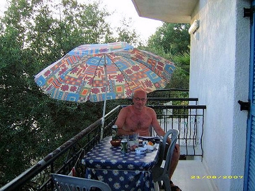 Ein Taxifahrer aus Platariá holte uns am Hafen ab und fuhr uns zu Vicki an den Laden. Dort bekamen wir erstmal einen Frappee und hatten uns viel zu erzählen. Dann hat Vicky uns hoch gefahren ins Haus Ingrid wo wir uns gleich wieder zu Hause fühlten :-) |