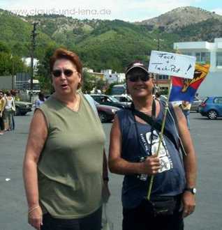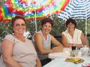 Endlich kam die Fähre an. Maria ist mit Lena vorgegangen, wir wollten die Reaktion der Beiden auf Lena testen. Kannten sich doch alle noch gar nicht und wir waren ja nicht da *g Tachpost kam mit Schild, beschriftet mit "Focki und Tachpost", ein paar Meter hinter ihm die Focki (wollte sie nicht erkannt werden? ) Ich versteckte mich so gut es ging hinter Iris. Focki begrüßte Lena mit den Worten "Ach lange nicht gesehen", drehte sich um, man sah, wie es arbeitete, aber dann hatte mich Tachpost entdeckt und schrie der Focki schon sehr laut "CLAUDIIIII" ins Ohr :-) Sie meinte, sie hätte den ganzen restlichen Tag davon Hörprobleme gehabt....