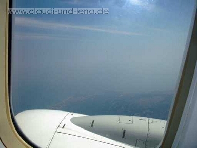 Wir waren mit die ersten die von der Fähre runtersind und haben auch noch ein Taxi ergattert. Ein netter Fahrer brachte und schnell zum Flughafen. Dort angekommen stand noch eine riesenlange Schlange Urlauber, die alle nach Erfurt einchecken wollten, doch Frank störte das nicht und drängelte sich in schwäbischer Manier vor....na ja hatten wir das Gepäck schneller weg. Gestartet sind wir dann letztendlich mit einer Stunde Verspätung, was daran lag, dass zwei Passagiere, die abends schon das Gepäck aufgegeben hatten nicht erschienen sind. Also musste das ganze Gepäck wieder ausgeladen werden, weil die Flieger nicht mit Gepäck ohne Passagiere fliegen dürfen. |