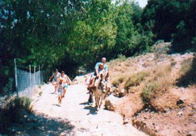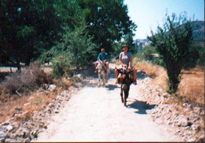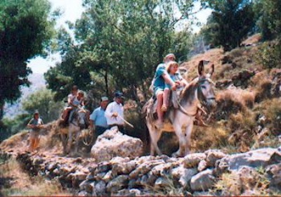 Da unsere Mädels auf einmal Lust bekommen haben auf Eseln zu reiten, beschlossen wir auf die Kreta Farm in Potamies zu fahren, deren Werbeschilder uns auf der Hinfahrt zur Lassithi aufgefallen sind. Unsere Anhalter verließen uns hier und sind zu Fuß weiter, sie wissen nicht, was sie verpasst haben. Es war dann das lustigste unserer Autotour. Die Farm ist sehr idyllisch gelegen, mitten in der Landschaft und sehr liebevoll gepflegt. Ein kleiner Zoo mit einheimischen Tieren erstreckt sich über den Hang und die Hauptattraktion sind geführte Eselritte und Kutschfahrten. Da es ein sehr heißer Tag war, hatte zu unserem Glück eine Reisegesellschaft abgesagt und so durften wir nach kurzer Zeit für DRS 3000 Pro Person einen halbstündigen Eselritt durch die Landschaft machen. |