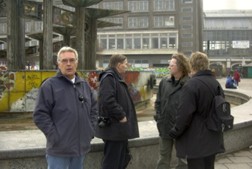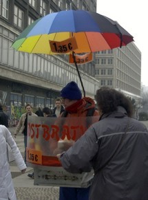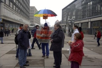 Er war gar nicht so sehr überrascht, als Sabine dann ich war ;-) Er ließ sich dann von Tamara helfen Rainers Rucksack aufzusetzten. Der Rainer hatte nämlich seine Handschuhe in den Hackeschen Höfen vergessen, wo die vier gefrühstückt hatten und mußte nochmal zurück. Derweil wärmten wir uns ein bischen in einem Kaufhaus auf. |