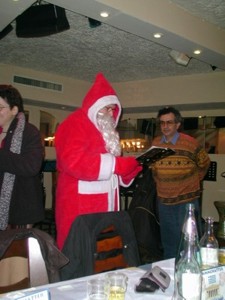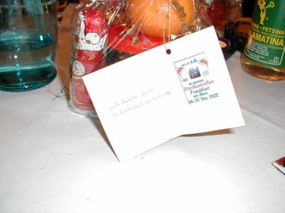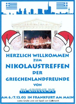 .......wir haben wirklich alle den Nikolaus gesehen :-) Am Freitag dem 06.12. sind wieder einmal aus fast sämtlichen Richtungen Deutschlands die in-greecler angereist, diesmal nach Frankfurt. Nico ist sogar vom Bodensee geflogen gekommen, war es doch auch günstiger als die Bahnfahrt ;-) Ich selber musste mal wieder bis 18.00 Uhr arbeiten, bin dann aber ohne Stau nach Ludwigshafen um Thommy abzuholen und wir sind gleich weiter nach Frankfurt gedüst. Sogar einen Parkplatz haben wir noch eine Querstrasse weiter vom Omikron gefunden, wenn auch nicht, wie die zuerst eingetroffenen direkt vor dem Lokal ;-) Begrüßt wurden wir gleich von Laki, Nico, Sabine, Petro, Gabi, Hotte, Manuela & Achim, Sofia & Eddi, Tamara & Rainer, Athene, Zorbas und Sabine. Natürlich war das Hallo groß mal wieder, einige hatten wir ja schon länger nicht mehr gesehen, andere noch gar nicht vorher. Es gab aber auch diesmal keinerlei Gefühl von Befremdung :-) Nach uns kamen dann noch Manos und Krebs. Und dann kam der Nikolaus........... |