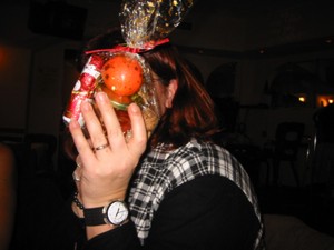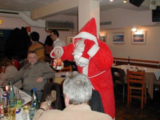 Er brachte auch für jeden was mit ! Leider hatte er vergessen, dass da zerbrechliche Sachen in seinem Sack drinnen sind......Honig, Nuss und Mandarinen und ein Schokonikolaus. Als er schwungvoll den Sack abstellte ist ihm dabei die einzige Flasche Olivenöl die mit dabei war kaputt gegangen.......leider :-( Scheinbar waren wir aber doch alle brav und haben jede/r ein Säckchen bekommen, die Rute musster er nicht einsetzten. Allerdings war der Wirt nicht so sehr begeistert wie man hier links sieht *gg |