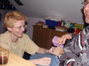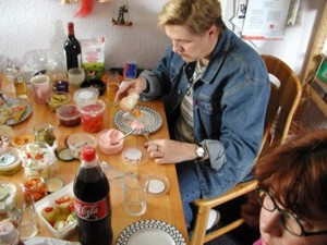 Ostern 2002 in Ludwigsburg sollte eigentlich in Ludwigshafen bei Thommy stattfinden. Da sich dann aber Tamara und Rainer, Anne und Thomas, sowie Petra und Sven "angemeldet" hatten, beschlossen wir bei mir zu feiern, immerhin habe ich ein Zimmer mehr als Thommy ;-) Also schnell das Kinderzimmer aufgeräumt, damit hatte jedes Paar ein eigenes Zimmer zum Schlafen. Da Lena Ostern dieses Jahr bei ihrem Papa verbracht hat. |