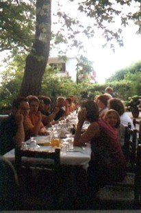 Nach echt griechischer Tradition hatten wir einen langen Tisch, der allerdings die Möglichkeit von Gesprächen mit den nicht direkten Nachbarn etwas einschränkte. Schnell ergaben sich doch wieder viele Gespräche, wobei Fotiní als "Simultandolmetscherin" fungieren musste. Lecker war das Essen, eigentlich hätten die Vorspeisen schon gereicht, so reichhaltig war es, tolle Mezeplatten, Choriatiki und Tsatsiki , hmmmmm. Auch die Hauptgerichte waren klasse, das Paradiso kann echt empfohlen werden! |