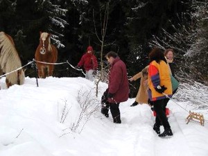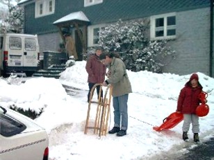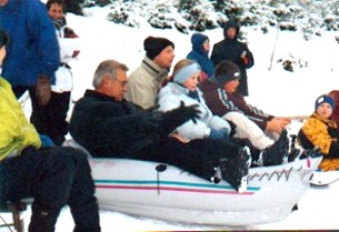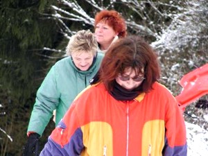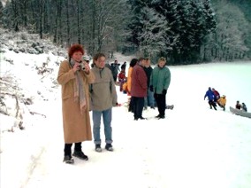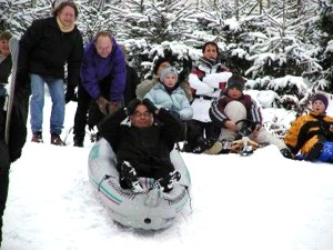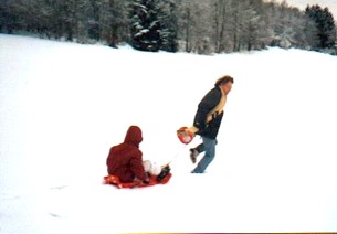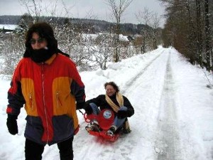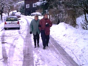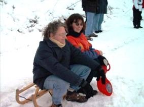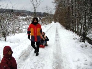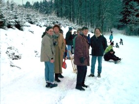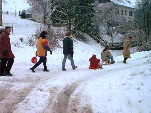 Also brachen wir am Sonntag mittag auf um einen Rodelberg zu suchen. Da Anne und Thomas bis jetzt noch keinen Rodelberg gebraucht hatten machten wir erst einen schönen Spaziergang durch den Schnee, nur die Sonne hat gefehlt, ansonsten war es ein wunderschöner Wintertag. |