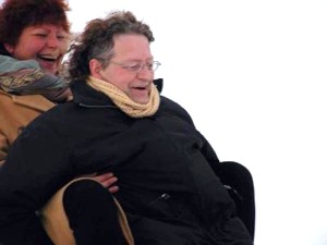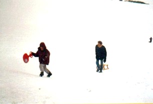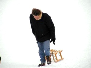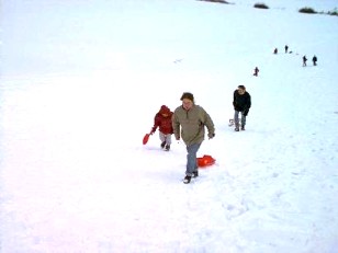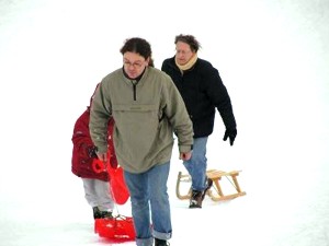 Angekommen am Rodelberg mussten sich ersteinmal alle überlegen, ob sie eine Abfahrt wagen sollen ;-) Thommy und ich blieben leider zweimal mit dem Schlitten im Schnee stecken, Anne und Thommy nahmen dann die eingefahrene Abfahrt und bekamen es besser hin ;-) |