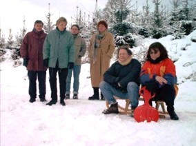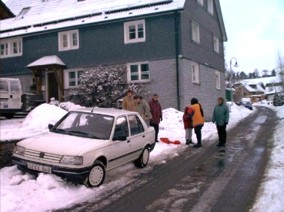 Schon am Samstag dem 29.12.01. sind Thommy, Lena und ich ins bergische Land aufgebrochen. Nach einer Fahrt durch Regen und ab Heilbronn durch Schnee sind wir doch zum Glück heil im tiefverschneiten Wahlscheidt angekommen. Am Abend wurde der Grieche im Nachbardorf besucht. Anne verplapperte sich bei Thommy, Lena und mir, indem sie schon am Nachmittag verriet, dass noch Rainer und Tamara aus Frankfurt kommen. Thomas wusste nichts davon *g Pünktlichst erschienen die Beiden in der Wirtschaft und die Freude war groß. Schnell riefen wir noch den Embona an, dass er doch mit seiner Embomaus wenigstens am Sonntag kommen sollte. Leider hatte Embomaus Dienst an Neujahr aufgedrückt bekommen, sodaß sie eben Silvester in der Nähe ihrer Wohnung verbringen sollte.