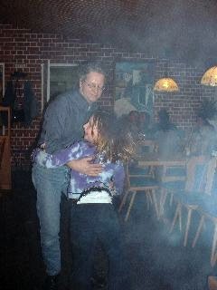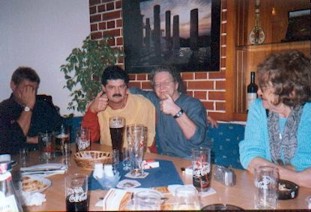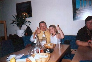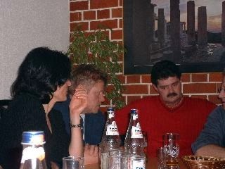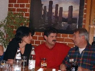 Leider war Handyverbot dort oben, aber Susannes Handy klingelte doch immer wieder. Captaino wollte den Weg wissen. Er erwartete uns dann auch unten am Fernsehturm und nahm den falschen Embona und Sofia sowie Susanne auch noch im Auto mit. Wir anderen liefen zurück. Im Vereinsheim wieder angekommen versuchte ich erst einmal den Tisch zu überblicken, auf einmal rief es von einem Tisch am Eingang : " Ich muß doch den Embona ins Koma knutschen !" - So eine Überraschung, saß doch Laki mit Pepe am Tisch :-) Und Thommy und ich sind direkt an ihr vorbei gelaufen ohne sie zu sehen ! Muss der Höhenunterschied gewesen sein *g Nun hatten wir drei Überraschungsgäste, ein feines Treffen *freu Leider musste Uno wieder gehen, da er noch auf einen Geburtstag eingeladen war. Dazu noch am Sonntag morgen in die Kirche zu einer Konfirmation, der Ärmste |