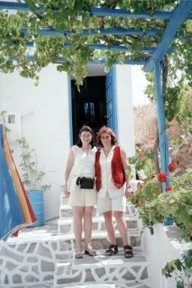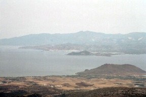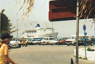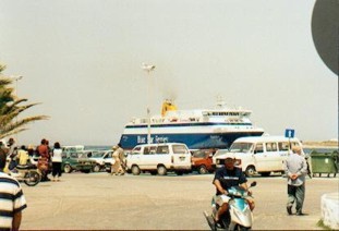 Mit einem Taxi ging es dann an den Hafen. Punkt 12.00 Uhr tauchte eine Fähre auf, es war leider nicht unsere, die kam dann erst um 13.00 Uhr ;-) Der Mann im Vordergrund auf dem Moped ist übrigens Sakis, Martinas Verlobter, den wir ja leider nicht getroffen hatten, keine Ahnung wie er auf das Bild gekommen ist ;-) |
