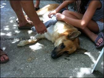 Als wir dann wieder auf dem Berg waren, war auch Michael von seinem Ausflug zurück. Und auch Romanos war verletzt, er ist in einem Bach wohl in eine Scherbe getreten und hat sich einen Ballen aufgeschnitten :-( Das war wohl der Samstag der Unfälle :-( Romanos wurde mit Antibiotika Spray, Verband und Socken verarztet, die Beulen der Mädels mußten nicht weiter behandelt werden. |