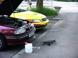 Leider verließ uns das Glück dann in Zürich. 16.30 Uhr, Berufsverkehr und auch Feiertag am nächsten Tag. Wir standen im Stau. Auf einmal ein seltsames Geräusch, erst dachte ich es sei das Auto vor uns, aber leider leider kam das Geräusch von Katherine, wie ich schnell an der steigenden Temperaturanzeige sah, also Heizung an und raus aus dem Stau an den Rand gefahren. Ein Blick unter die Motorhaube und es war wie wir vermutet hatten der Ventilator, Na lange hat der für 20.- nicht gehalten, haben wir ihn doch nicht erst vor ein paar Wochen mit einem Gebrauchtteil ersetzt. Also die Panne Ausland Nummer angerufen. Kurz darauf rief mich dann meine Autoversicherungzurück, ein Herr F. und nannte mir die Nummer des Schweizer TCS. Leider waren die total überfordert und es sollte 1 bis 2 Stunden dauern. |