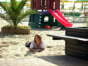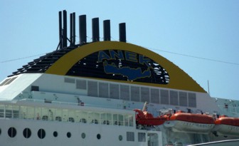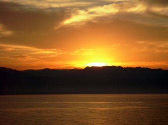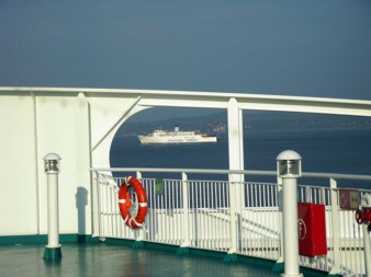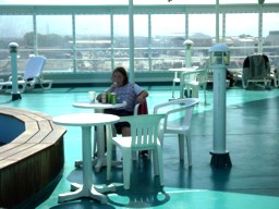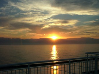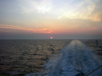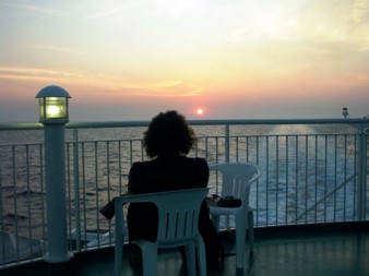 Wir schnappten unser Gepäck und gingen zur Rezeption. Dort wurden wir in unsere Kabine AB2 8139 geleitet, alle drei, wie Maria es vorhergesagt hatte. Hatten wir doch nur zu zweit die Kabine und dazu eine Deckpassage gebucht. Lena wollte natürlich gleich an den Pool, den haben wir auch gesucht und gefunden, nur leider war kein Wasser drin. Auf Nachfrage hieß es, es käme nur morgens Wasser rein. Natürlich war da jemand dann sauer. Andere erzählten nachher, daß man früher hätte fragen müssen….eigentlich egal, es war halt kein Wasser drinnen. An der Poolbar versorgten wir uns mit Getränken, Knabbereien und saßen gemütlich in der Sonne bzw. im Halbschatten. Gegen 17.00 Uhr legte die Fähre dann ab. Irgendwann gingen wir ins Self Service Restaurant. Das Essen war recht gut, allerdings waren weder an der Bar, noch im Restaurant Preisausszeichungen, wir zahlten um die 30 .- für zwei Hauptgerichte, ein Fanta, eine kleine Flasche Wein, einen Salat und ein Tsatziki. Ausgeglichen wurde das dann von dem Zigarettenpreis, eine Stange Assos International lights für 15.-, witzigerweise nur an der Bar zu diesem Preis, im Duty free Shop kosteten sie 20.-. Den Sonnenuntergang nahmen wir dann noch mit und gingen dann recht bald in die Kabine zum schlafen. Waren wir doch nach der Fahrt und der recht unbequemen Autoschlafstunden rechtschaffen müde. |